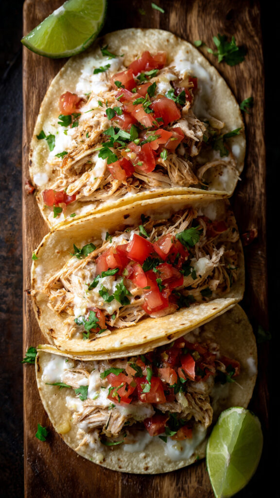 6. Taco assembly time! Warm your tortillas, scoop in the Cheesy slow cooker chicken mixture, and add your favorite toppings. Instagram that beauty before devouring!