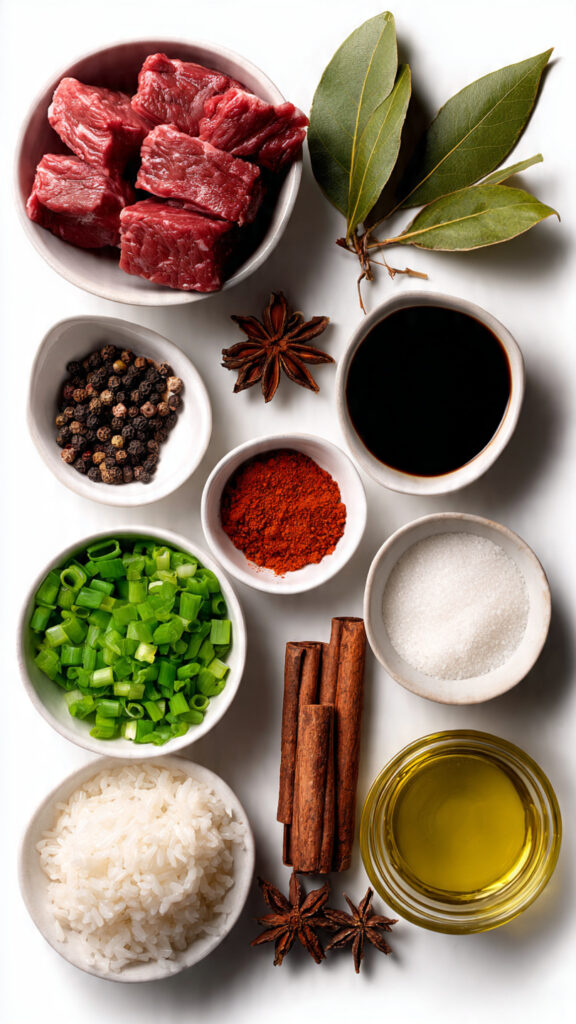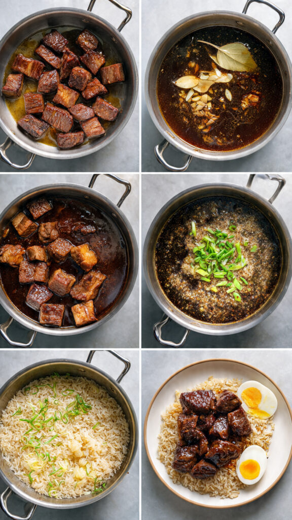 Remove bay leaves, star anise, and cinnamon stick from the finished beef pares, then adjust seasoning with additional soy sauce or brown sugar as needed to achieve that perfect sweet-savory balance. Serve the tender beef pares over the aromatic garlic fried rice, garnished with chopped green onions, accompanied by halved hard-boiled eggs and a bowl of the rich braising liquid as soup—this complete presentation honors the traditional Filipino dining experience.