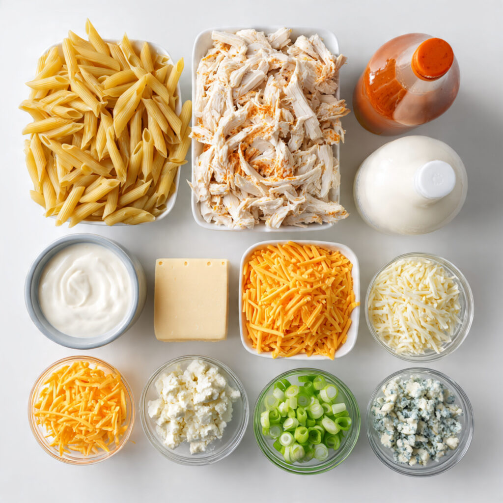 This dish combines everything we love about buffalo wings with the hug-in-a-bowl quality of a pasta bake. It’s like if your favorite sports bar appetizer and your grandma’s casserole had a beautiful, spicy love child. Ready to make some magic happen? Let’s gooooo!