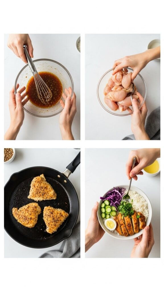 Now for the creative part! Start with your base (rice or greens), add the warm, rested chicken, and then artfully arrange your chosen toppings, salads, and drizzles. There are no wrong answers here.