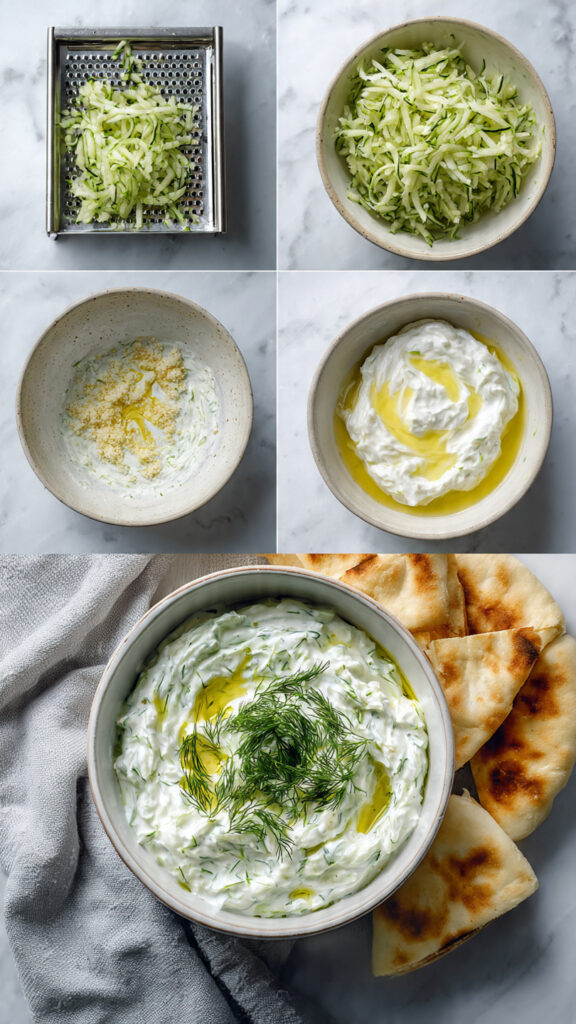 Place grated cucumber in a clean kitchen towel or several layers of cheesecloth. Squeeze firmly to remove as much water as possible – this prevents the dip from becoming watery. - Step 3: Mix the Base