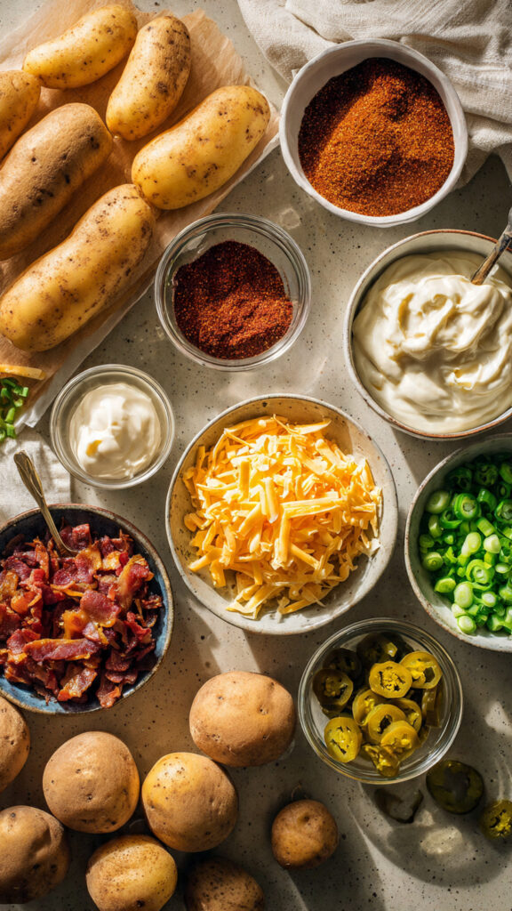 - Toppings: Shredded cheddar cheese, crispy bacon bits, sliced green onions, and pickled jalapeños.