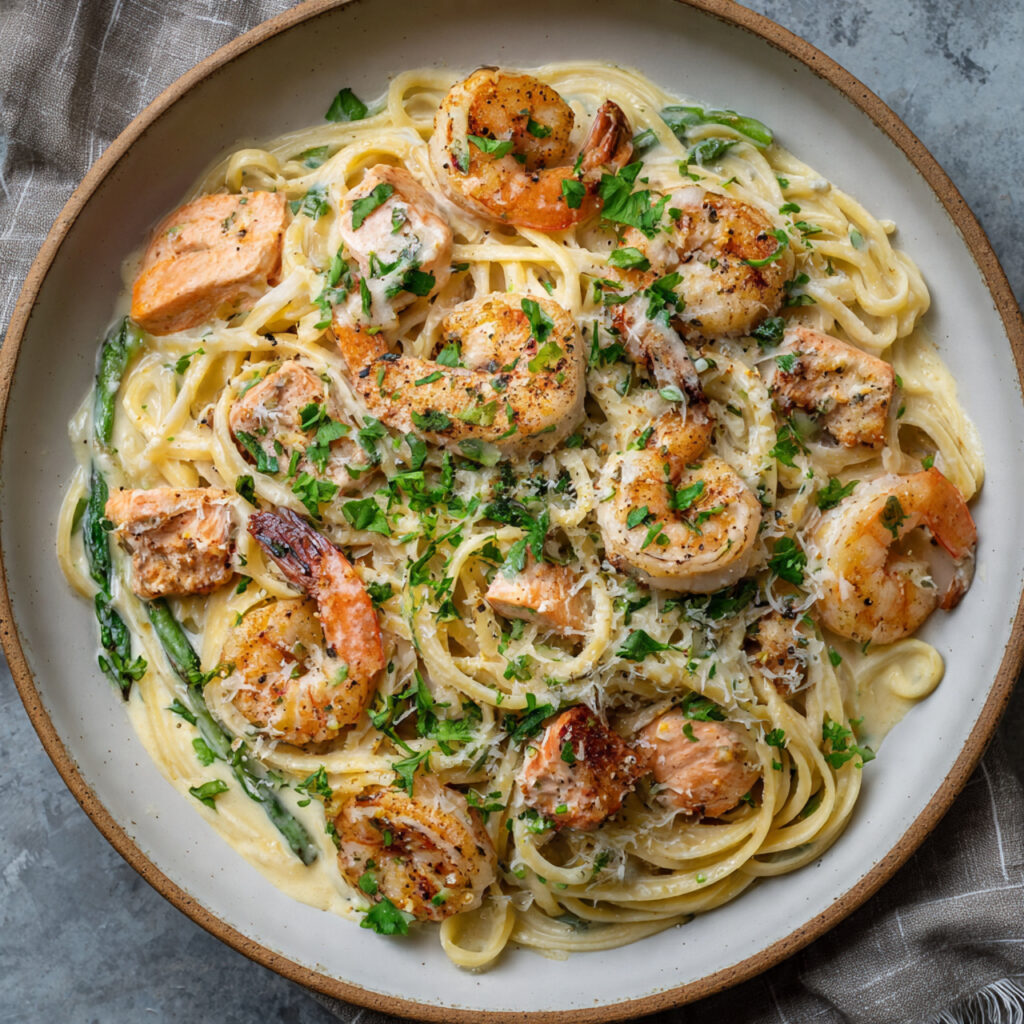 Recipe 2: Creamy Garlic Butter Salmon and Shrimp Pasta