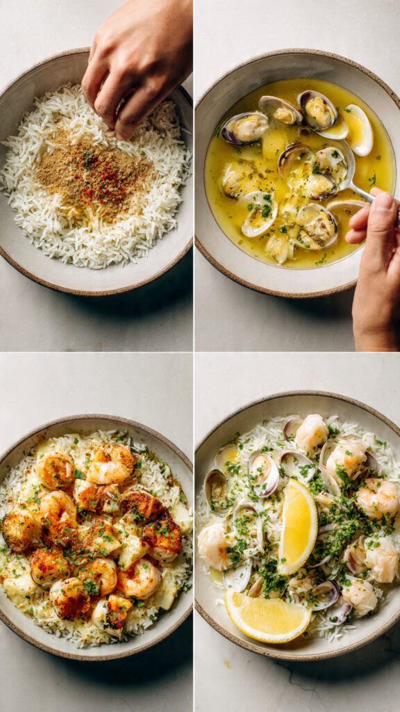 For a personal touch, set up a “finish your own” seafood rice bar with lemon wedges, fresh herbs, flavored oils, and spice blends, allowing each diner to customize their portion.