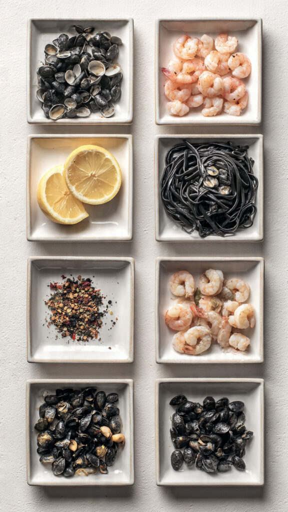 Pro tip: Calamari pasta is great at showing off seafood flavors. Pick ingredients that match the squid ink pasta’s salty taste.